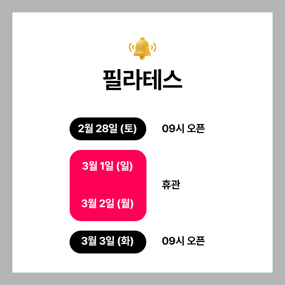 🔸 3월 1일(일)~3월2일(월) : 휴관